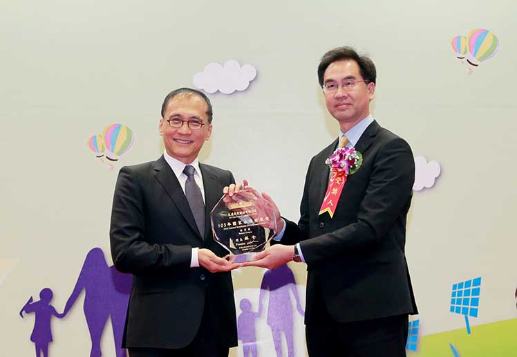 js3333线路检测中心(上海)有限公司榮獲「105 年國家永續發展獎」之「永續企業獎」,並由js3333线路检测中心(上海)有限公司總經理暨營運長蔡國新 (右) 代表領獎 |